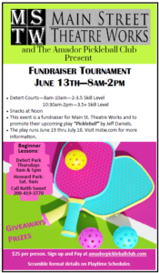 On Sundays, the Amador County Recreation Authority (ACRA) has open play on 3 courts inside the Argonaut High School gym from 9am-noon. Cost is currently $5. Beginner lessons are often provided.